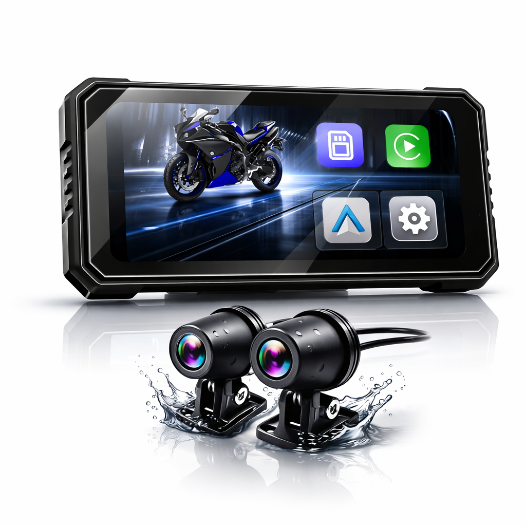 Get wireless CarPlay & Android Auto, reliable GPS navigation, IP67 waterproof resistance, and dual DVR recording (front + rear) in one compact, detachable unit designed for real-world riding.